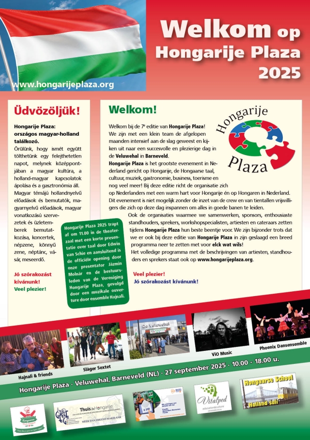Ook zijn er enkele lezingen in het Hongaars, waardoor ook de Hongaren in Nederland hun geest kunnen verrijken tijdens dit geweldige eendaagse Hongarije Plaza-festival! Zie Lezingen & workshops.