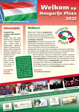 Hongarije Plaza begint op zaterdag 27 september 2025 om 10 uur en is om 18.00 uur afgelopen. In die acht uur kunt u een zeer gevarieerd en boeiend programma verwachten met Hongaarse cultuur, dans en muziek, info over Hongarije, Hongaars eten en alle gelegenheid om Hongarije te leren kennen als vakantieland en wellicht als second of new home! Voor degenen die al bekend zijn met Hongarije is het een geweldige gelegenheid om mede-liefhebbers te ontmoeten en nieuwe contacten te leggen en om diverse interessante lezingen bij te wonen of workshops te volgen. Ook voor Hongaren in Nederland brengen wij een attractief programma.
